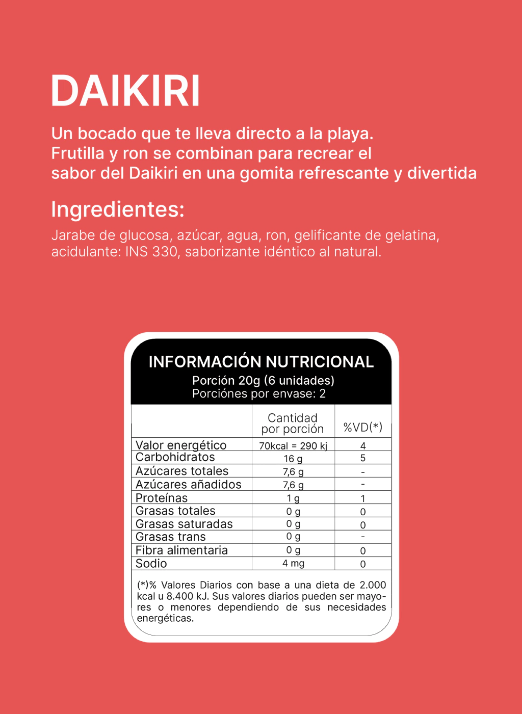 Caja de 12 unidades de 40 gramos de gomitas sabor Daikiri. Un bocado y ya estás en la playa con un daikiri en la mano. La dulzura de la frutilla se une a la frescura del ron para recrear ese trago que amas. Ideal para los que buscan una experiencia divertida y refrescante en cada gomita. ¡El verano está a un mordisco de distancia!